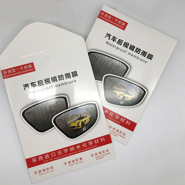 是最近流行起來(lái)的一種高科技保護(hù)膜,基材是PET膜,一面涂布高粘油膠,使用透明離型膜貼底面,另一面涂納米防水/親水材料,用藍(lán)色PET保護(hù)膜做面,使灑落在后視鏡上的雨霧可以很快滴落,而達(dá)到防雨防霧的效果。